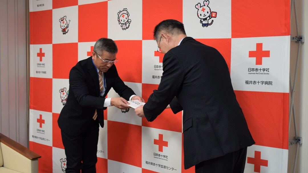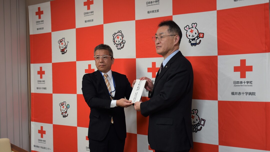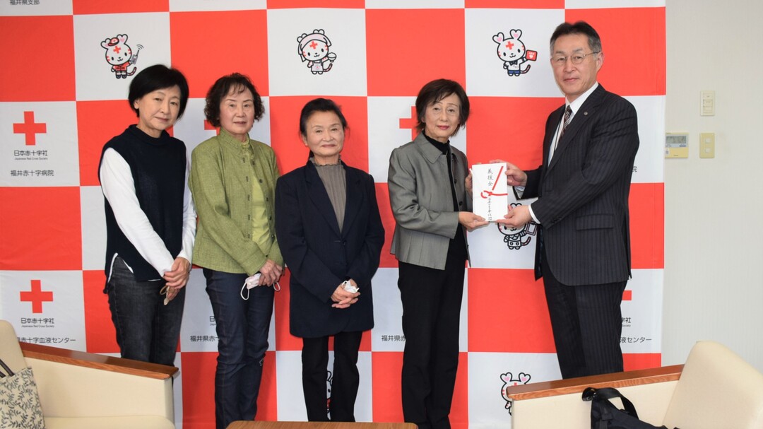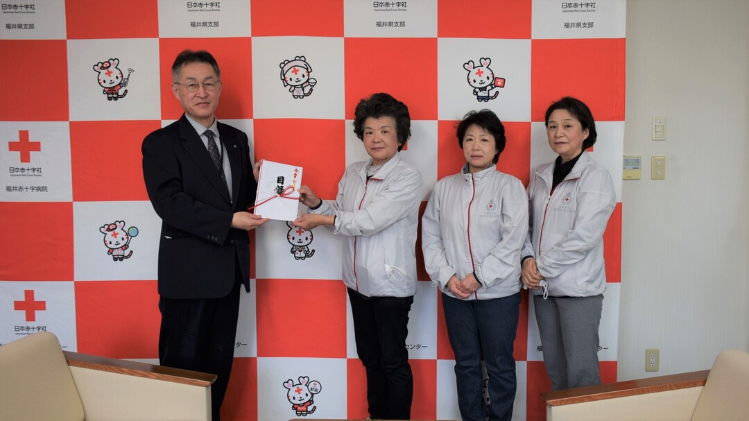 越前市赤十字奉仕団(永田和子委員長)から4月17日、救援金を届けていただきました。