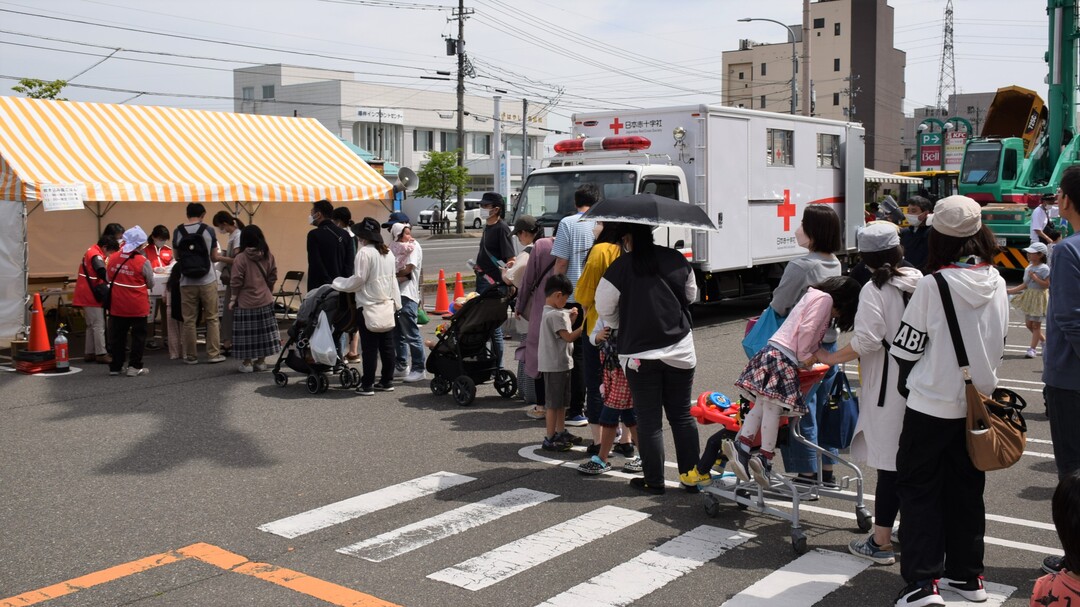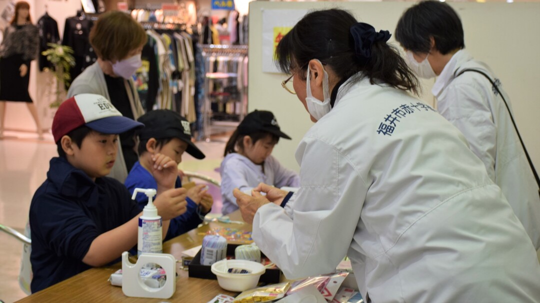 福井市のショッピングシティ・ベルで5月3日(水)から5日(金)に開催された「はたらくクルマ大集合 2023」に日本赤十字社福井県支部が参加しました。昨年度に引き続き2回目の参加となりましたが、今年も連日、大勢の人が訪れ大盛況となりました。