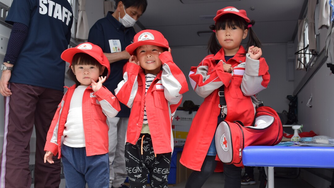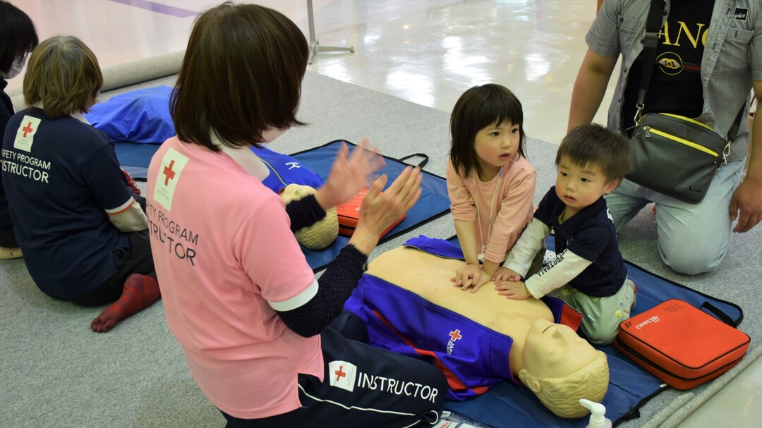 また、今年は新たに子ども用救護服の試着コーナーと救急法の体験コーナーを設置。救護服の試着コーナーでは、救護服を着てポーズを決める子どもたちやそれを撮影する保護者の方たちで賑わいました。救急法の体験コーナーには子どもから大人まで幅広い年代の方が体験に訪れ、中には医療ドラマに憧れて体験に訪れる子もいました。