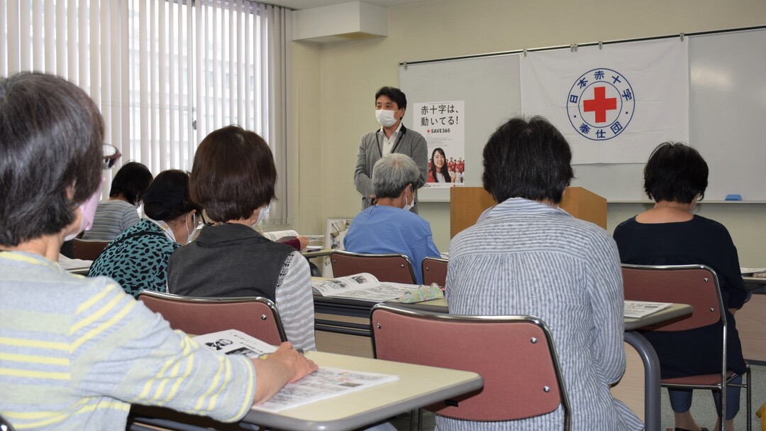 当県支部では、山本裕行事務局付部長が赤十字の成り立ちや奉仕団の歴史について説明。団員らは山本部長の軽妙な語り口を楽しみながらも真剣に耳を傾けていました。