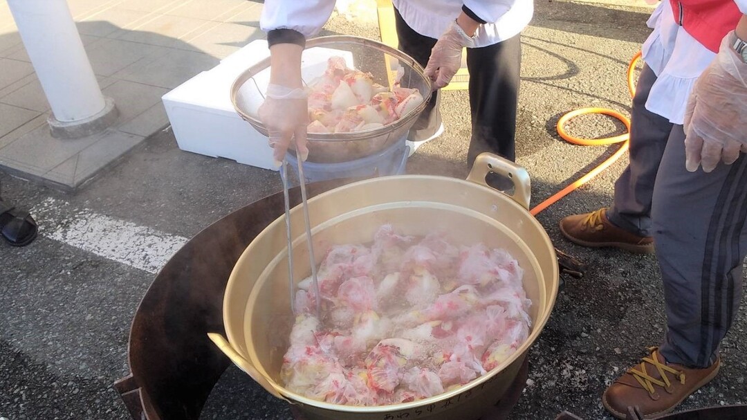 昨年度に引き続き、同奉仕団はハイゼックスを使った炊き出し訓練を実施。今回は、水とコメ、サツマイモ、塩を入れたハイゼックスの袋を鍋で煮て、サツマイモご飯を作りました。調理の過程で重い鍋などを扱う場面もありましたが、男性団員4人の活躍により、無事300人分のサツマイモご飯が完成。作ったサツマイモご飯は訓練の参加者に配布しました。