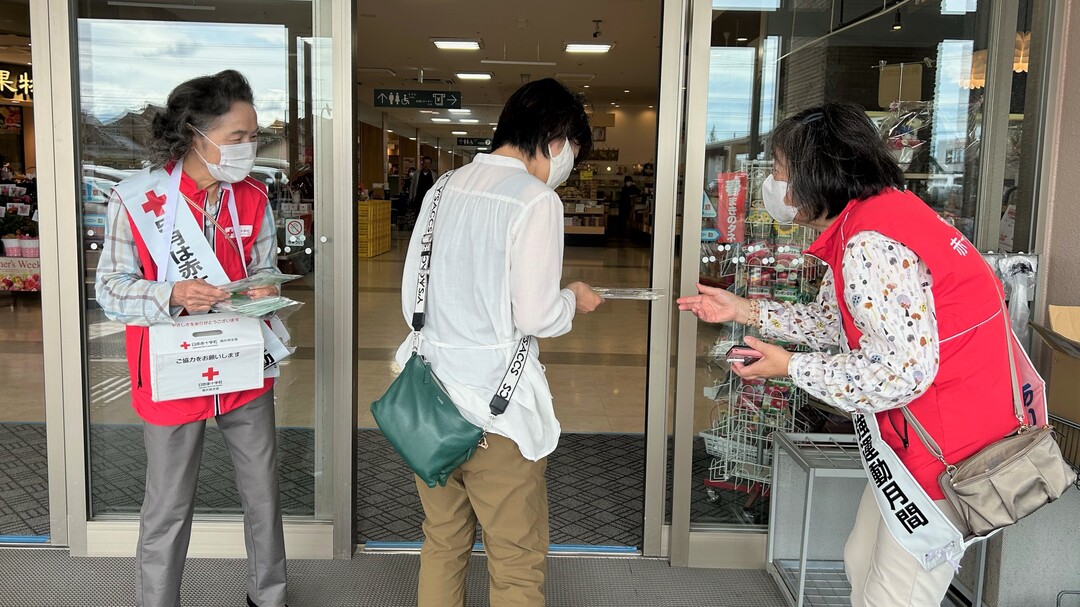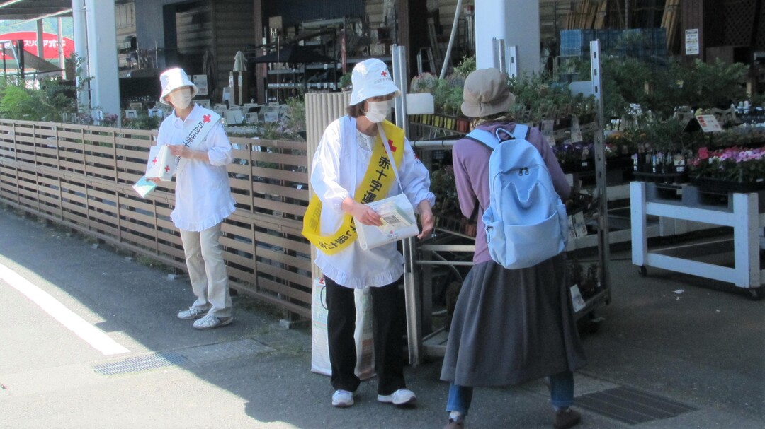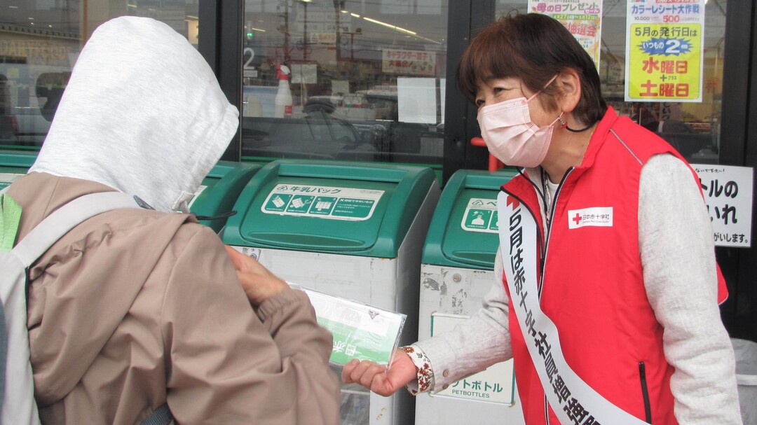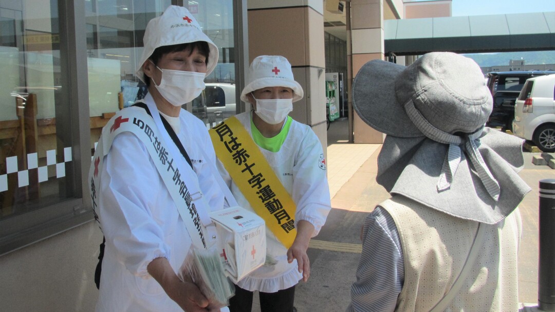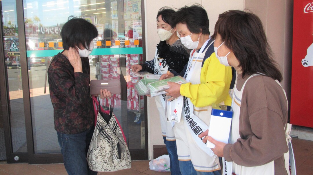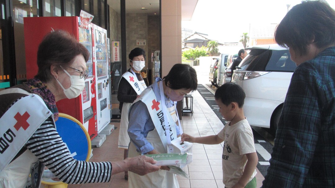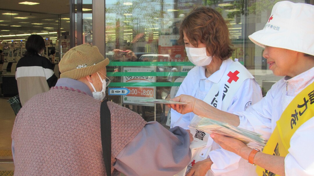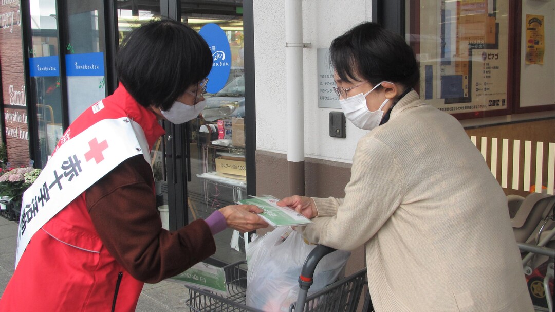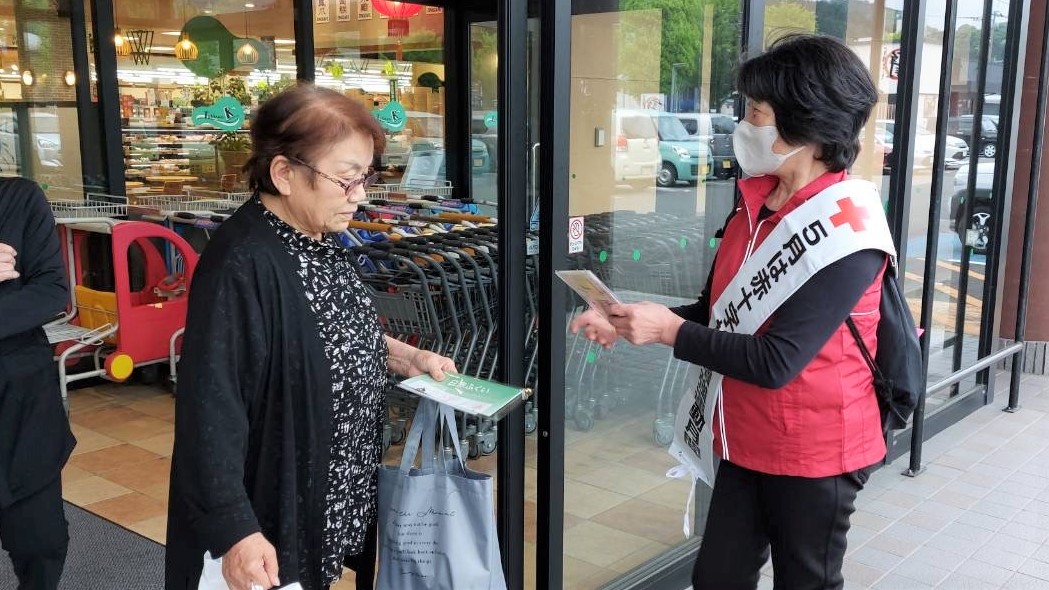 今年も県内各地の商業施設等で、奉仕団員が赤十字の広報チラシやマスクを手渡しながら赤十字の活動への理解と協力を呼びかけました。