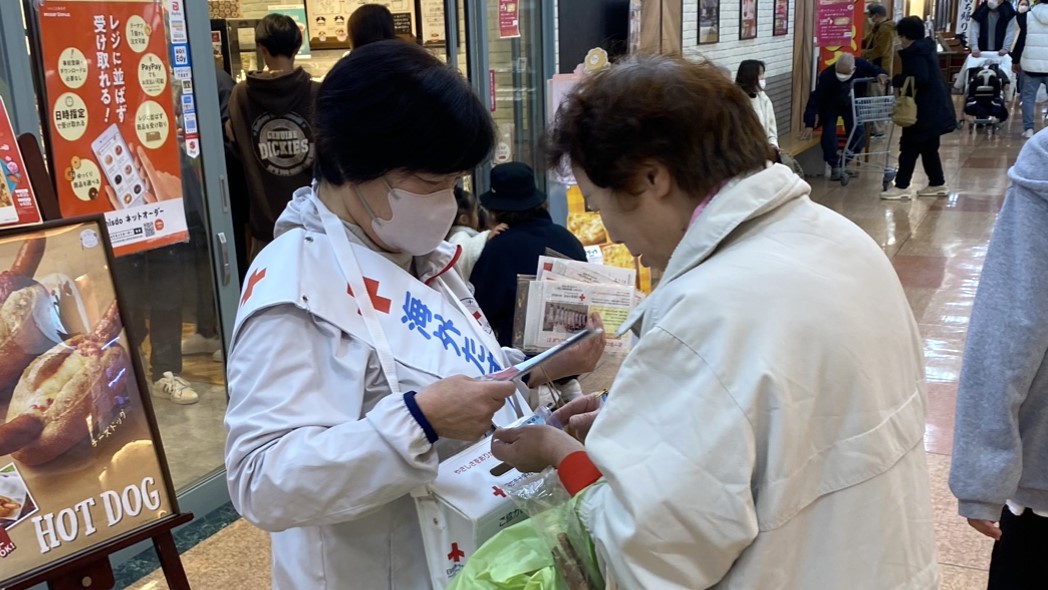 福井県支部では、毎年県内各地で街頭キャンペーンを実施しています。今年も、地域の赤十字奉仕団員やJRC加盟校の児童生徒が商業施設などで募金を呼びかけ、買い物客や親子連れなど多くの方に協力いただきました。