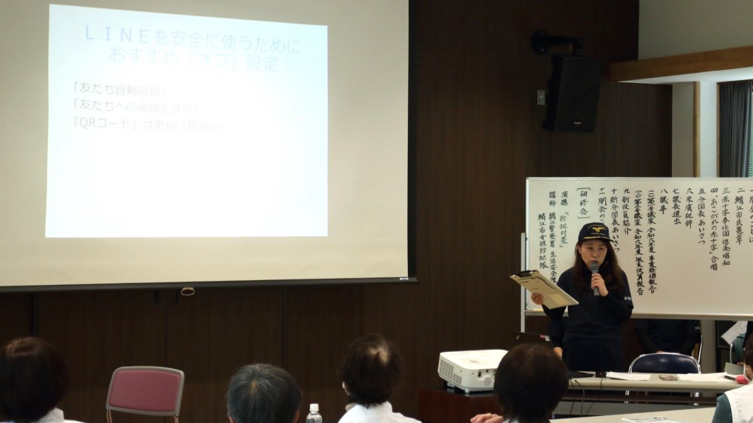 研修会では、鯖江警察署生活安全課の鯖江市女性防犯隊を講師としてお招きし、防犯対策についてお話しいただきました。防犯対策全般に関する説明のほか、近年増加しているLINEのチャットを使用した詐欺に関する寸劇などを通して、日常生活の中で気を付けるポイントについて学ぶことができました。また、だまされやすさを測るチェック表を使って、自分の心理傾向についても知ることができました。