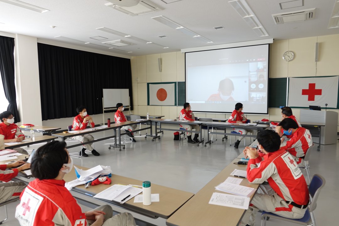 7月は、本県支部に隣接する福岡赤十字病院の職員のみ参集し、その他施設の職員はオンラインで参加。救護班主事の役割に関する講義や、グループワークとして後続の救護班に引き継ぐための情報付与訓練を行いました。