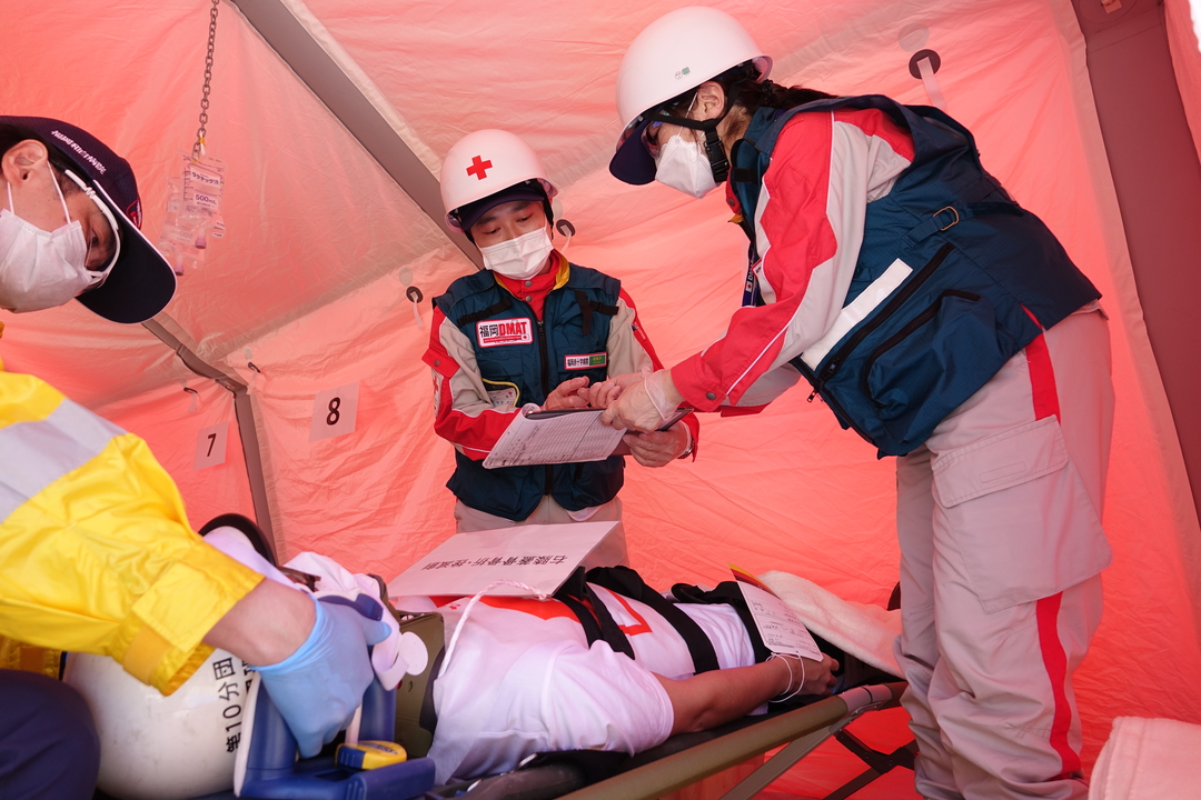 篠栗町会場では、福岡赤十字病院DMAT班が、倒壊家屋、座屈ビル等から救助された人を救護所で受け入れ、救急隊や他病院DMAT班と協働して傷病者の診療を行いました。