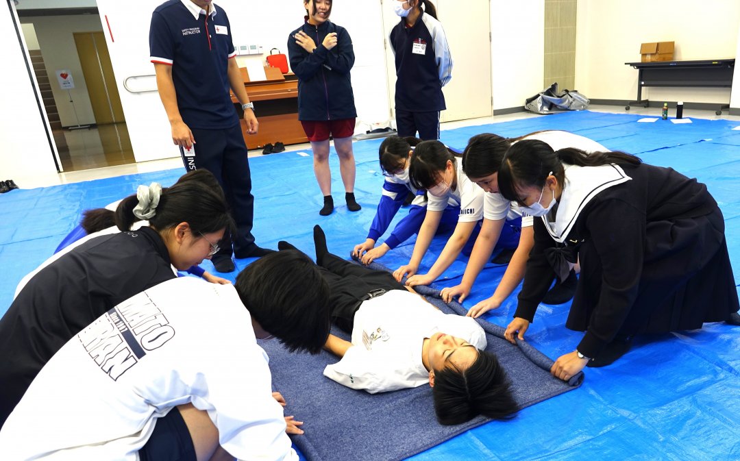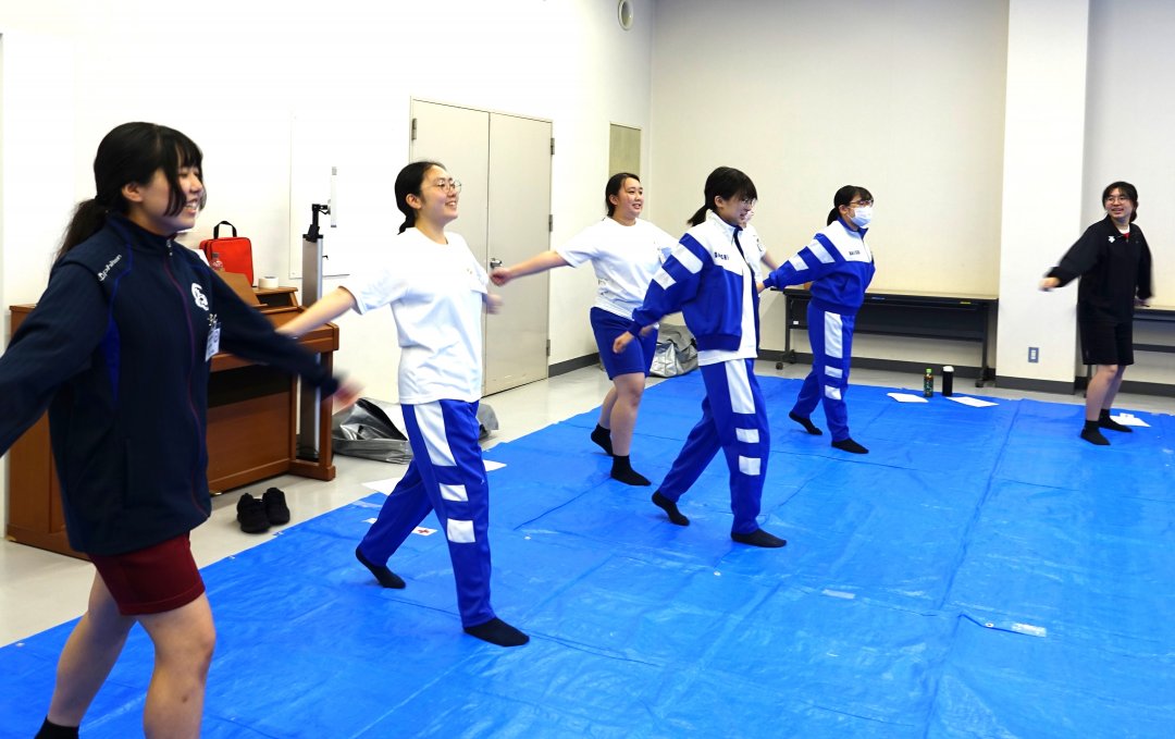 また、搬送に関する講習の前には、怪我予防の準備運動として、福岡第一高等学校のオリジナル体操(一高体操)を行いました。他校のメンバーは、初めての動きに戸惑いながらも楽しく体操ができました。搬送では、傷病者への動揺を少しでも抑えようと慎重に接し、無事搬送を完了しました。