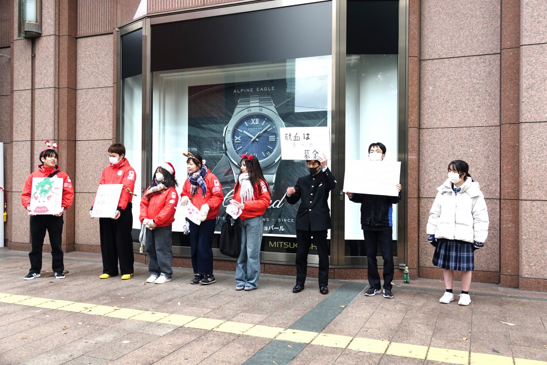 午後からは、福岡学生献血推進協議会(学推協)のメンバーが、福岡市役所・ふれあい広場で開催している『クリスマス献血キャンペーン』に参加し、学推協のメンバーと協力して、会場周辺の街頭で献血呼びかけを実施しました。