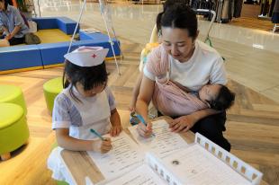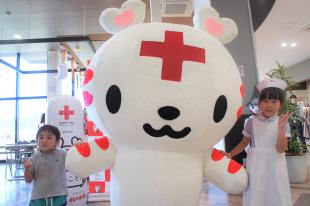 また、キッズ救護服・ナース服の試着コーナーも設け、着替えた子どもたちは日本赤十字社の公式マスコットキャラクター「ハートラちゃん」との記念撮影を行いました。撮影した写真を受け取った子どもたちの嬉しそうな表情がとても印象的でした。