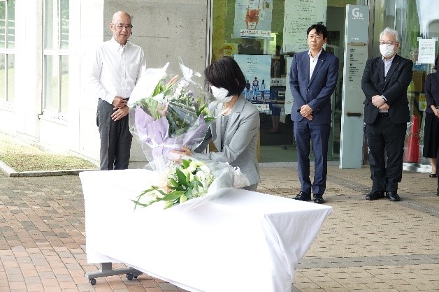 理事会開会前には、上田米藏氏のご令孫である理事長の上田康藏様と同看護大学の小松浩子学長から、上田米藏像に献花が行われました。