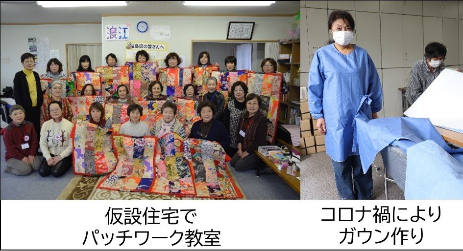 福島県内の赤十字の元職員の方々で構成され、赤十字活動の支援のほか、被災者支援活動を行っています。約8年間10か所の仮設住宅でパッチワーク教室を行いました。コロナ禍ではマスク・ガウンを作成し福島赤十字病院等へ寄贈しています。
