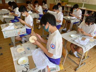 村雲氏の説明を真剣に聞く生徒 丁寧な作業で記念コースターを完成させました