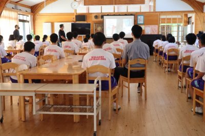 令和3年7月20日、東白川村立東白川中学校において、村の伝統産業である林業を学ぶ、全校生徒参加のふるさと学習が開催されました。