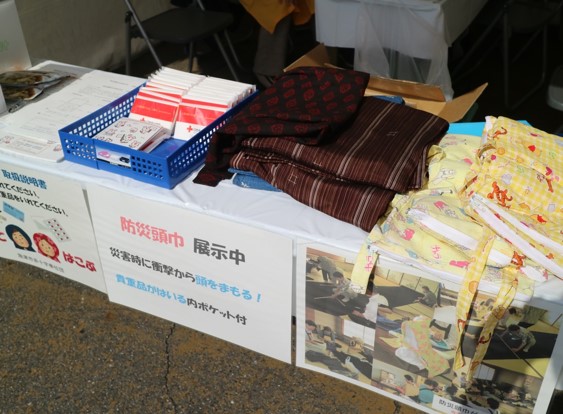 海津市赤十字奉仕団ブースでは、着なくなった着物を活用して、中身にタオルを使用した「手作り防災頭巾」の紹介やパネルによる赤十字の活動紹介などのほか、ウクライナ人道危機救援金の募金を呼びかけました。