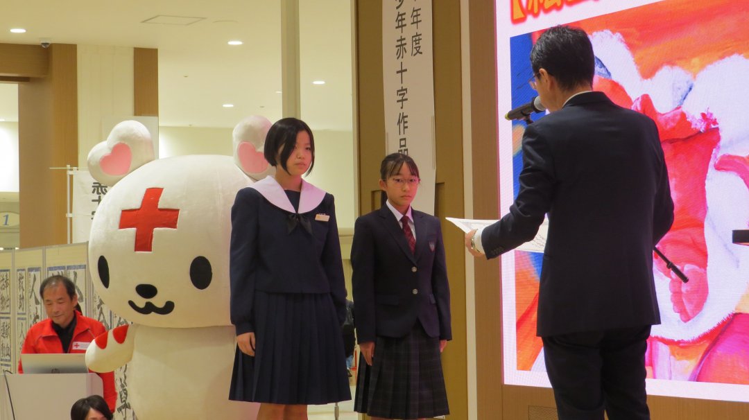 赤十字を身近に感じていただくためのイベントとして、県内各地で開催しています。その会場で、青少年赤十字加盟の幼稚園・こども園・保育園・小学校・中学校・高等学校・特別支援学校から「青少年赤十字作品コンクール」に応募していただいたたくさんの作品の中から、入賞されたこどもたちの作品展示と表彰式を行っています。
