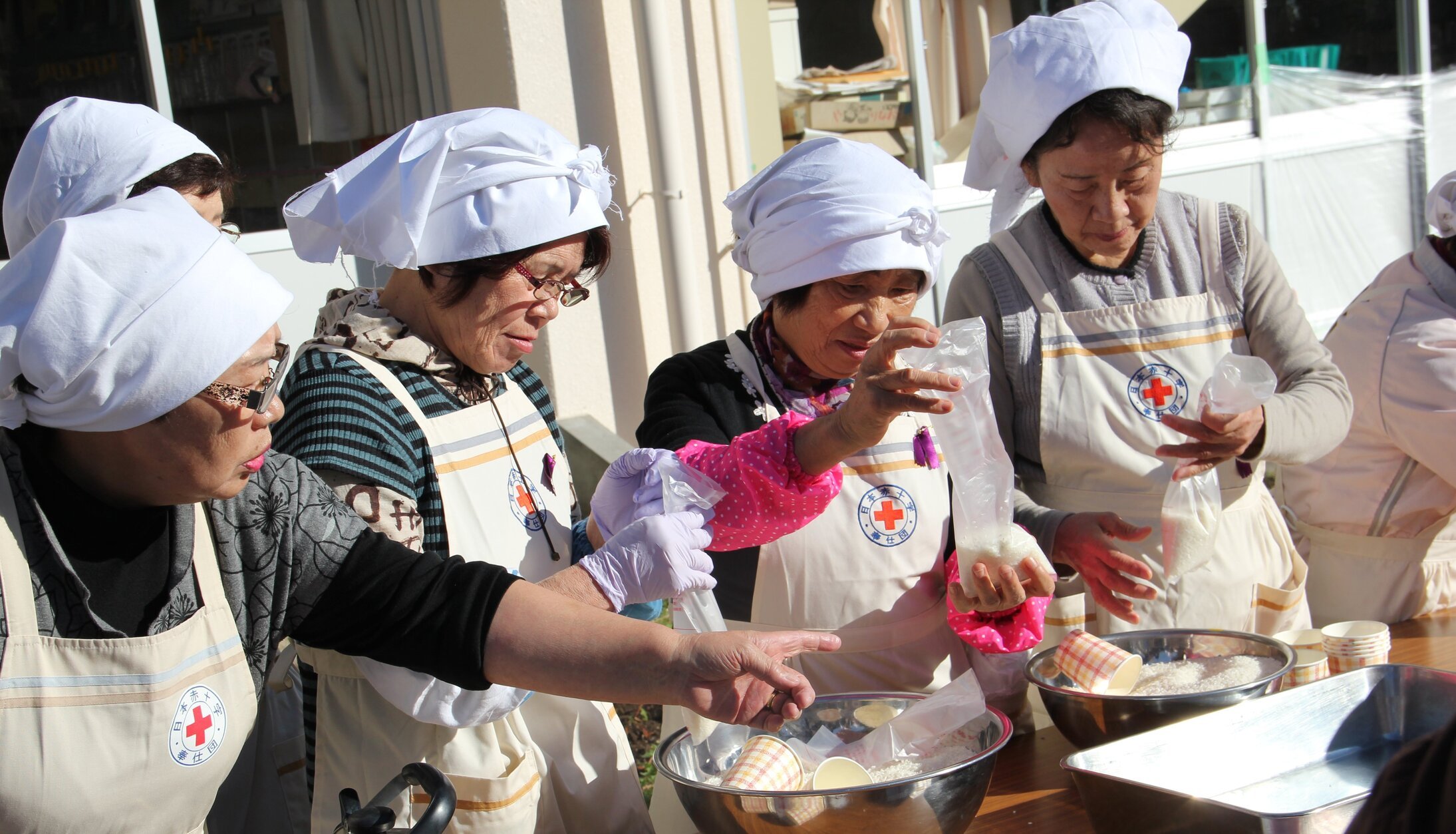 福祉施設への訪問、地域の清掃活動、赤十字社員募集などの奉仕活動のほか、各地域のニーズに応じて炊き出し訓練をはじめとした研修会や、地域自治会と協力して防災訓練などを行っています。