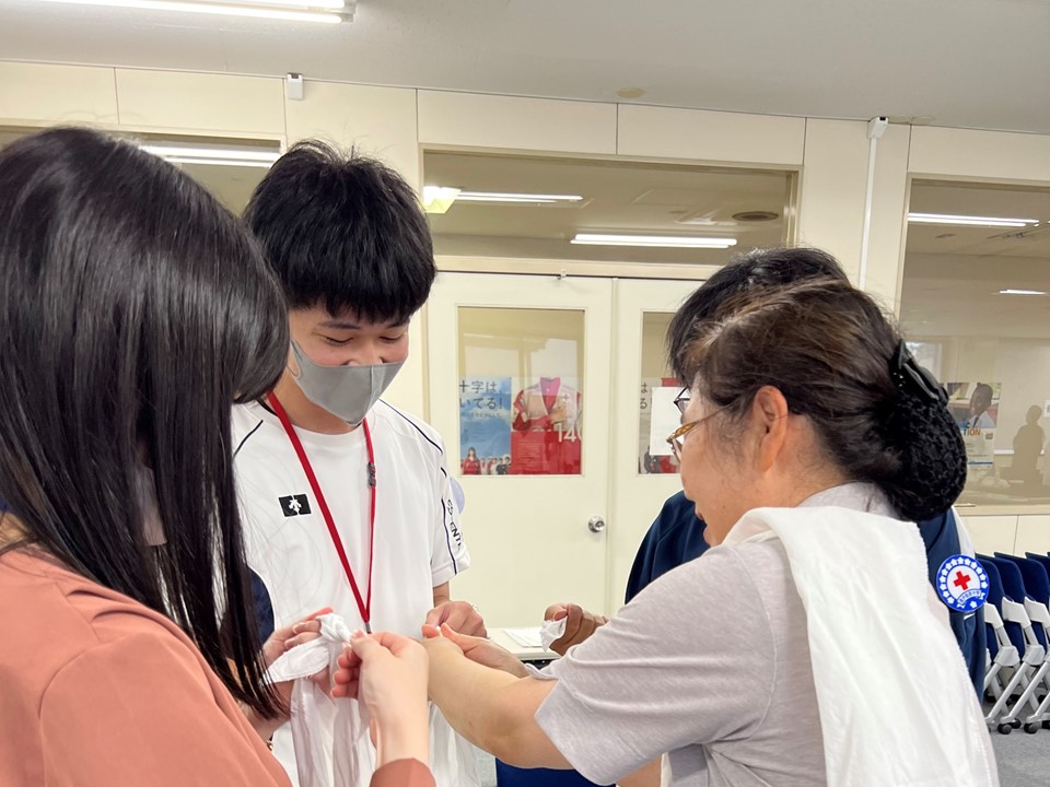 包帯を使用した傷の手当の方法を習う様子(高校生)
