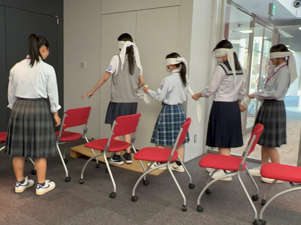 目を覆い、手首が繋がっている仲間を先頭の一人が指示する様子(高校生)