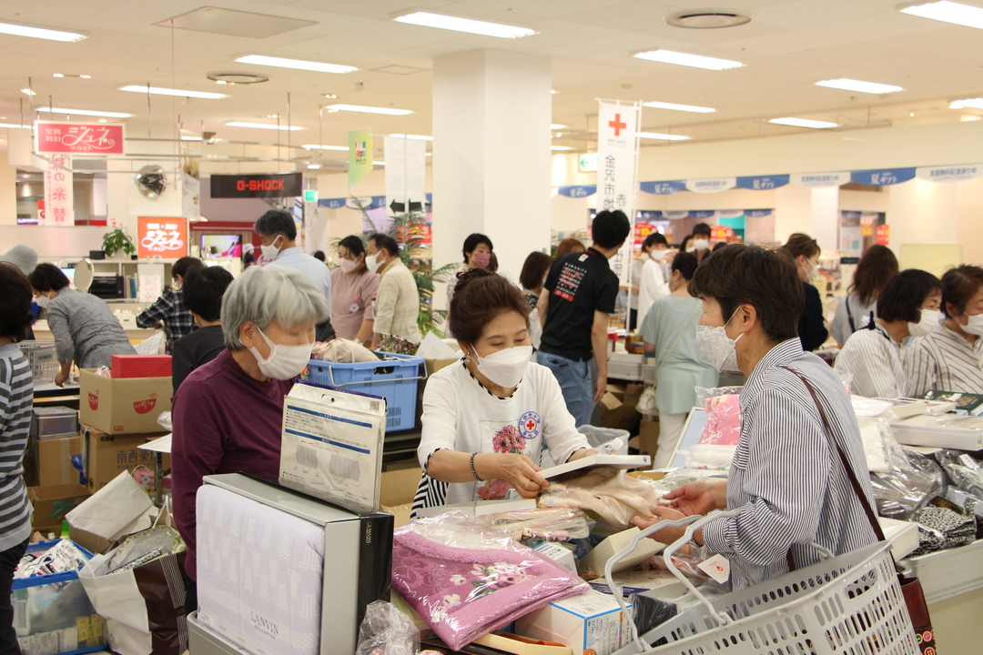 5月29日(日)、金沢市地区赤十字奉仕団がアルプラザ金沢店で3年ぶりにチャリティーバザーを開催しました。市内33奉仕団の団員が集めたタオルや洗剤などの日用品が多数並び、多くのお客様がお買いになりました。