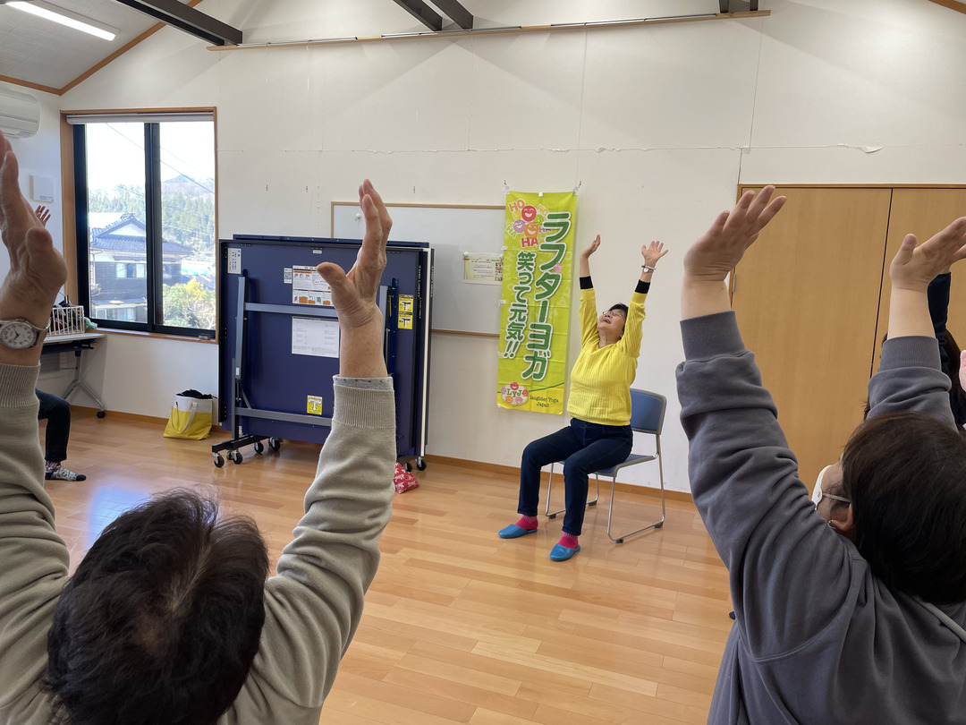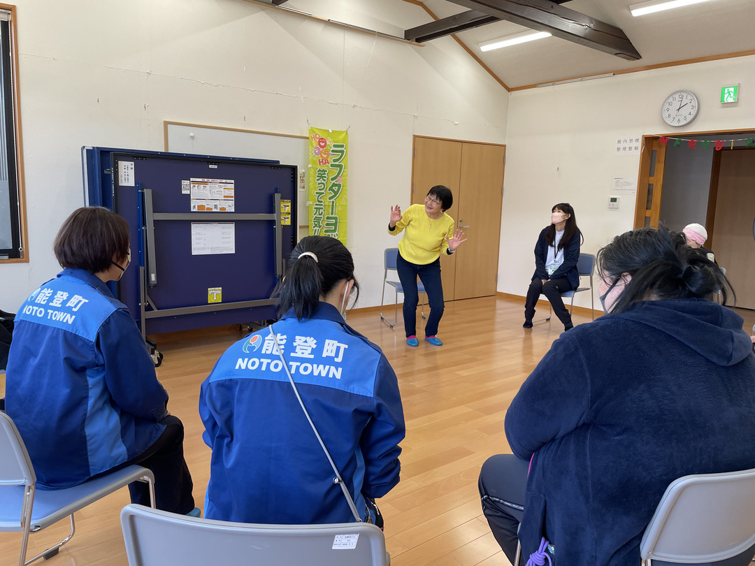 ラフターヨガとは、笑いと呼吸を組み合わせた健康体操です。避難者は、笑いながら手拍子と掛け声に合わせ身体を動かし、楽しい時間を過ごしていました。避難者の笑顔から町の職員や赤十字のスタッフも元気をもらいました。