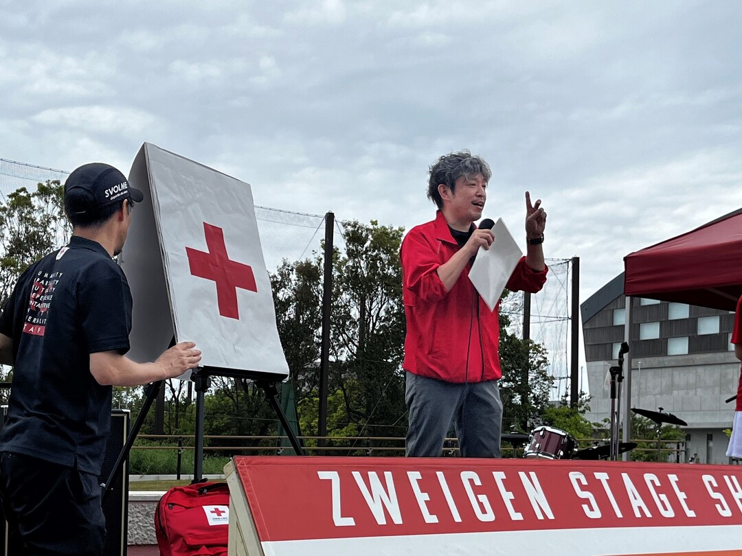 スタジアム前のステージでは防災・減災クイズをおこない、クイズの正解者へレスキューフードや赤十字防災セットをプレゼント。