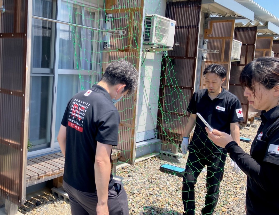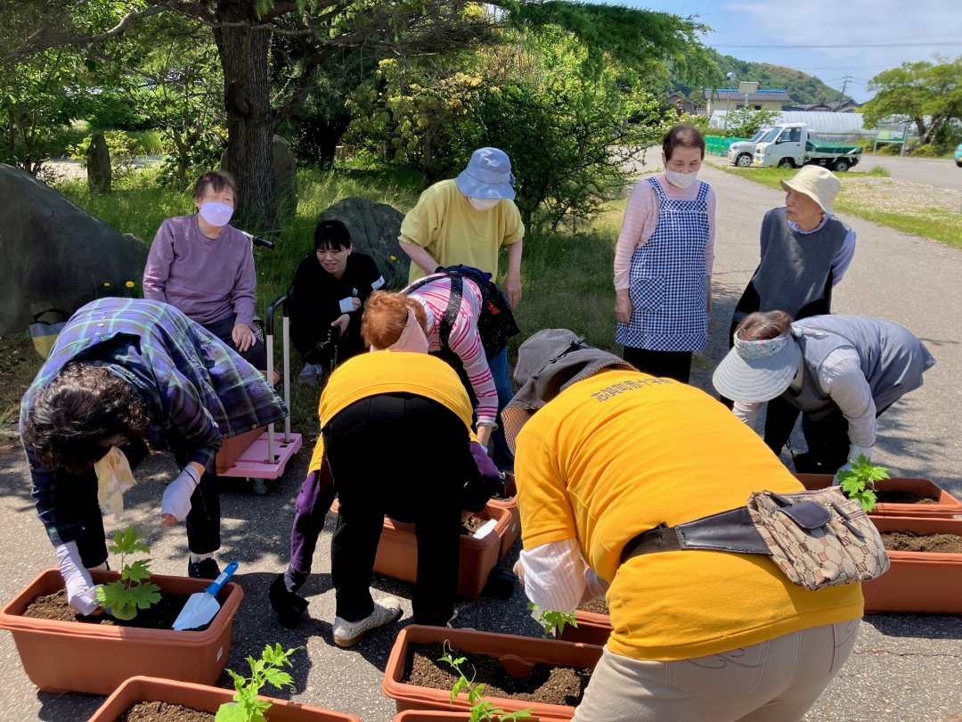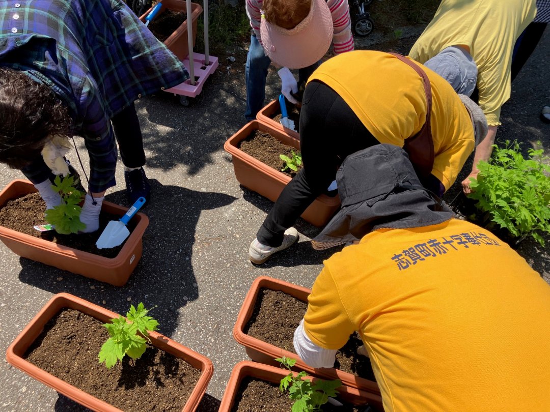 5/30(金)、志賀町社会福祉協議会・志賀町赤十字奉仕団と共同で町内の仮設住宅にグリーンカーテンの設置を行いました。プランターにゴーヤの苗を植え、窓の辺りにネットを張って完成です。グリーンカーテンは真夏の日差しによる暑さ緩和の機能に加え、設置すること自体がご近所同士のコミュニケーションや運動不足解消に一役買います。この日はお天気も良く、皆さんが協力して活動されていました。