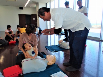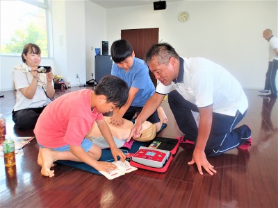 救急法体験では、心停止になった溺者に対する手当の方法として心肺蘇生・AED体験を行い、親子で声をかけあい、協力しながら胸骨圧迫や人工呼吸等を学んでもらいました。