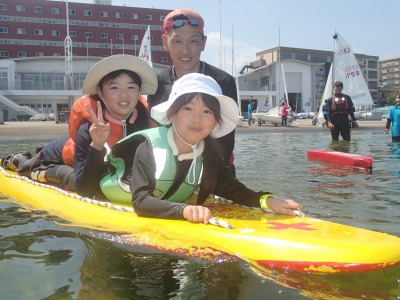 レスキューボード体験では、赤十字安全奉仕団の水上安全法指導員がサポートし、どの親子も上手に乗りこなせるようになりました。また、水難救助で使用されるレスキューチューブも紹介し、水難救助の一部を体験してもらいました。