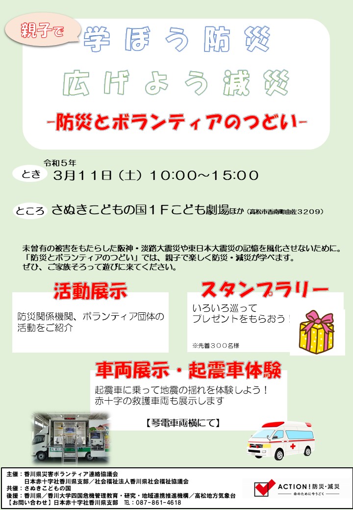 3月11日に「親子で学ぼう防災、広げよう減災 -防災とボランティアのつどい-」を開催します。