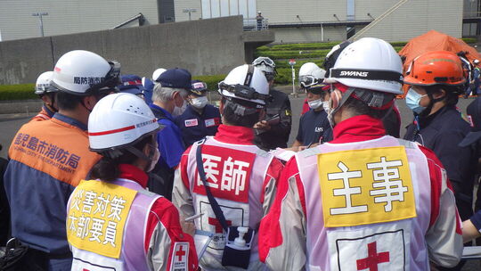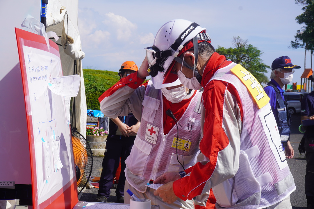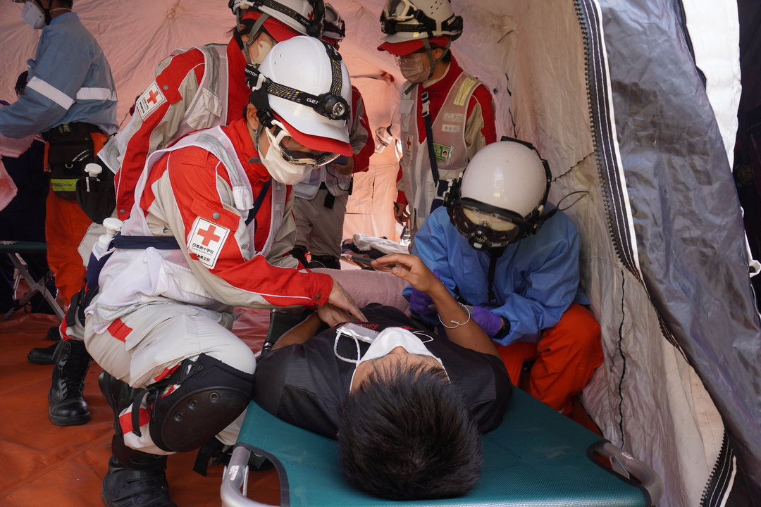訓練では、救護所の設置からDMATや消防と連携して医療機関に搬送するまでの流れを確認しました。