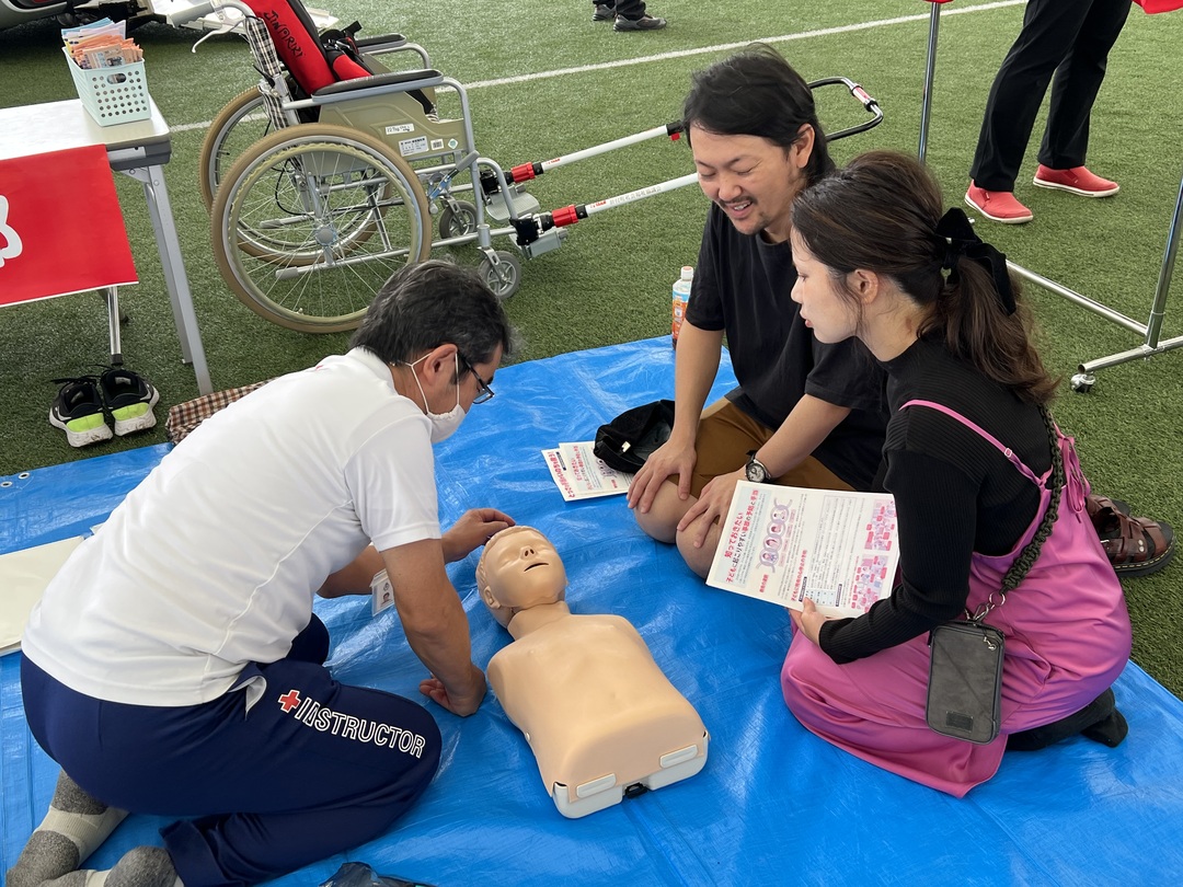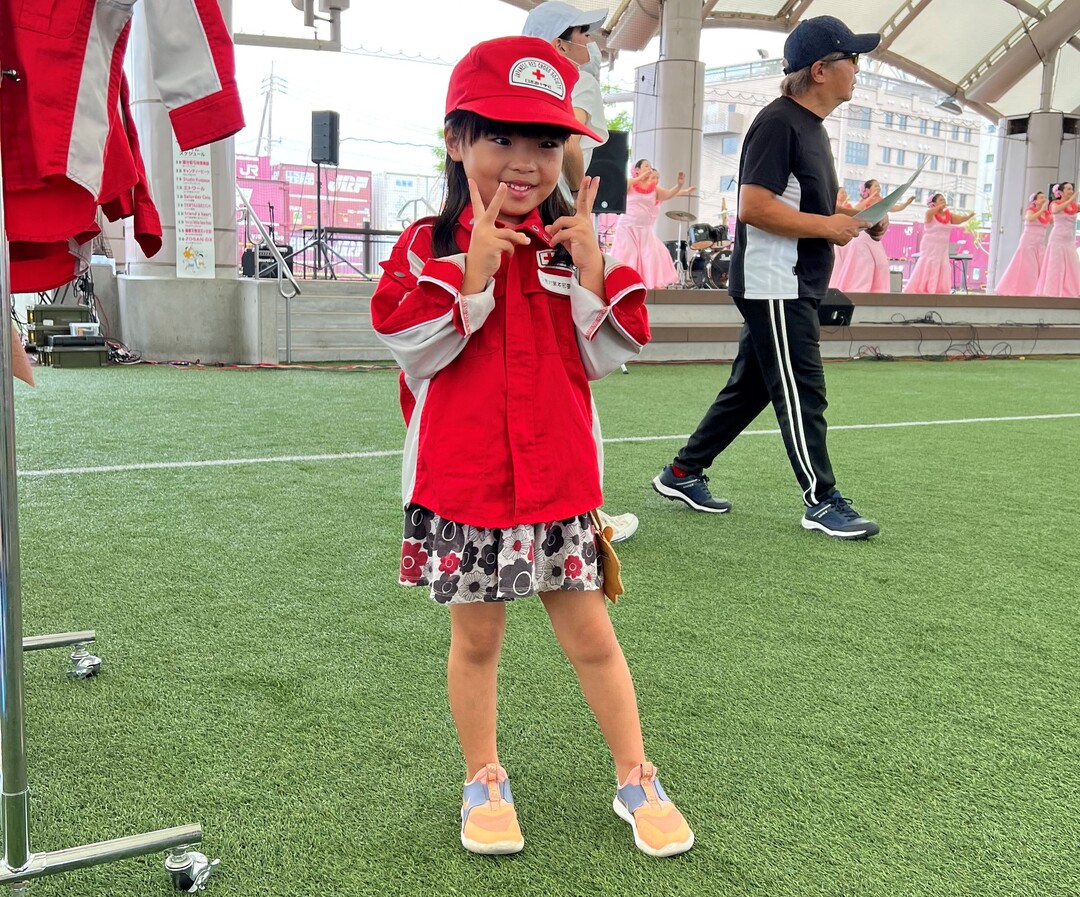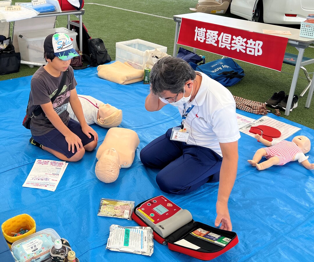音楽ステージやキッチンカーなどが集まるイベントで、鹿児島県支部のブースでは心肺蘇生体験やキッズ救護服の試着などを体験いただきました。