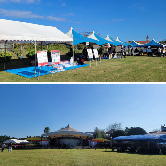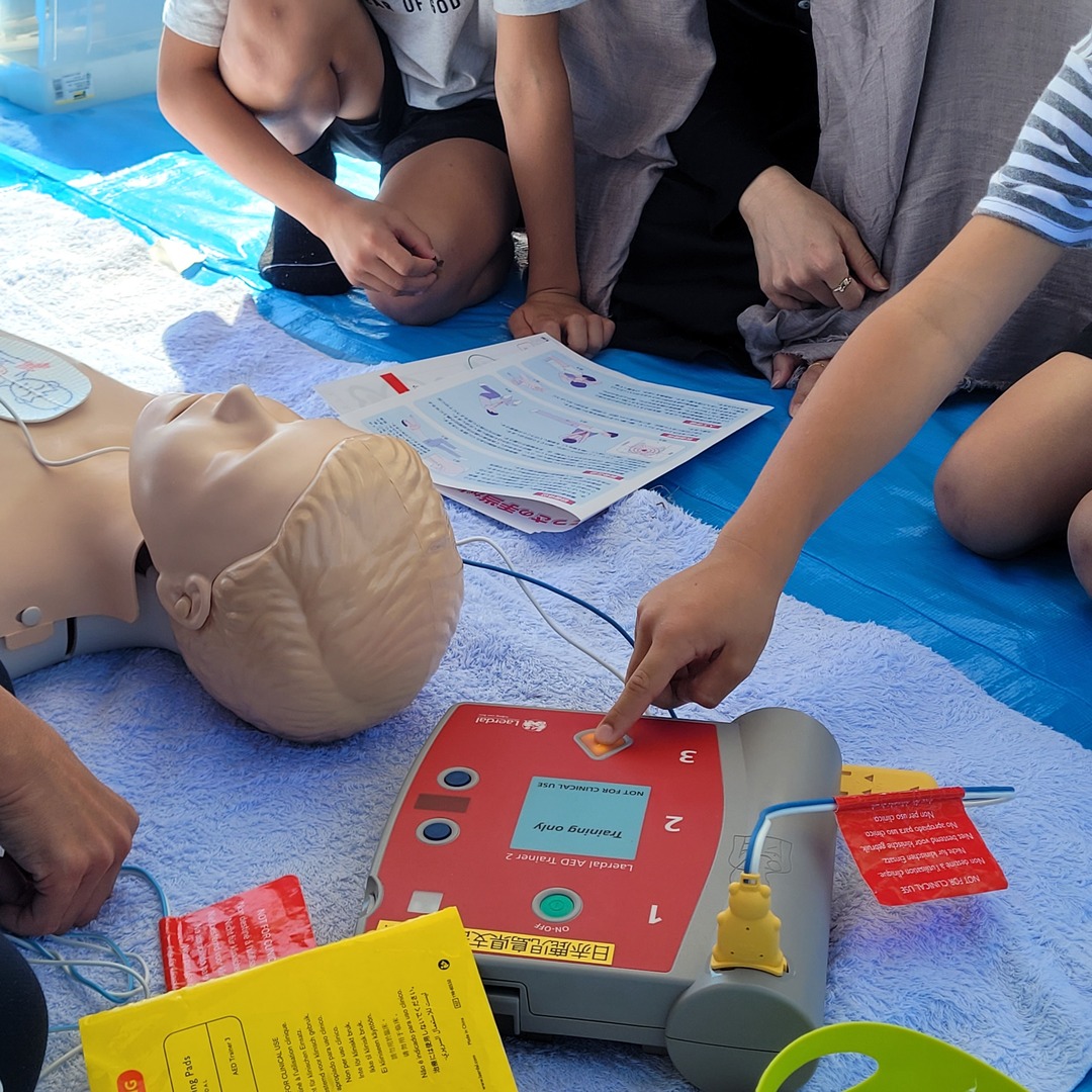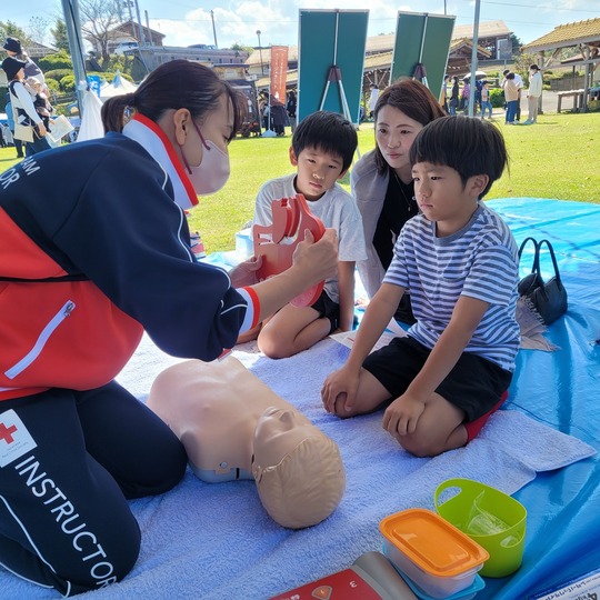 飲食ブースや、ステージでの音楽の演奏、ゲストを招いてのワークショップなどが行われるイベントで、鹿児島県支部は救護体験ができるブースを出展しました。ご家族連れの方を中心に多くの方にご参加いただきました。