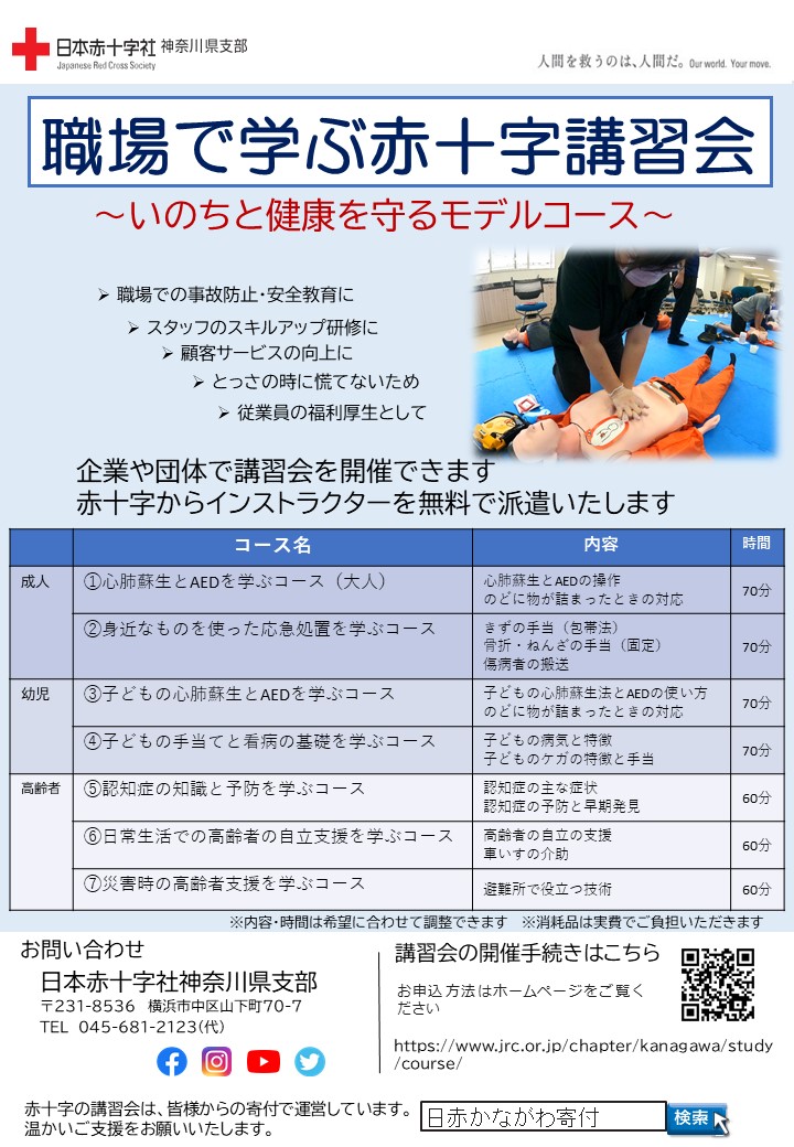 企業の社会貢献への参加に応えるために、従業員を対象とした救急法などの講習を実施することで、広く救急法の普及を図ると共に、職場での事故防止や安全教育に役立つ7つのモデルコースを用意しました。