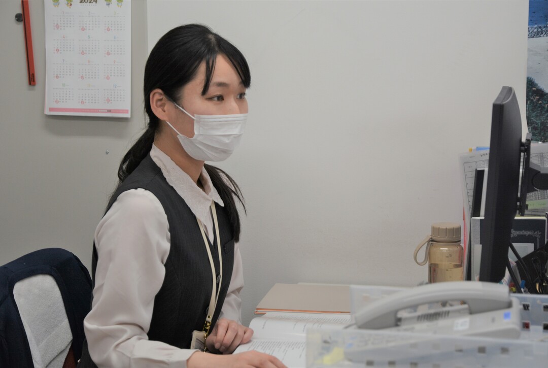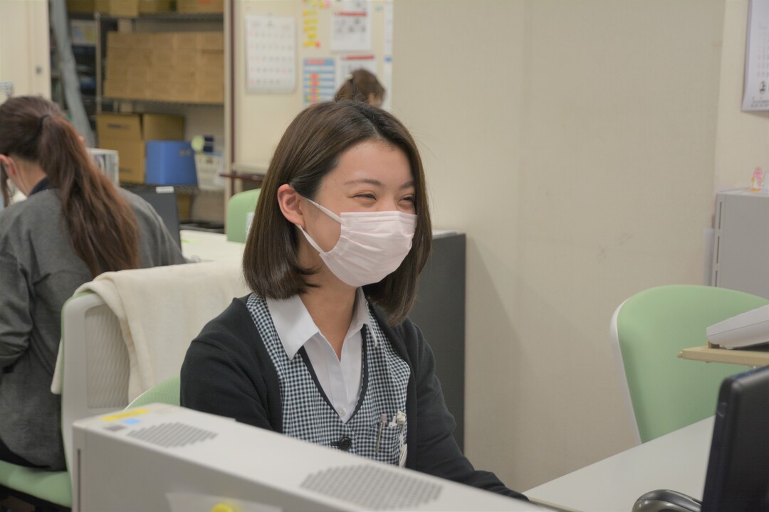 私は、経理業務、受付などを担当しています。正しい事務処理やお金の管理を行うことで、人から信頼され、良き仕事・成果につながると自分の業務に取り組んでいます。