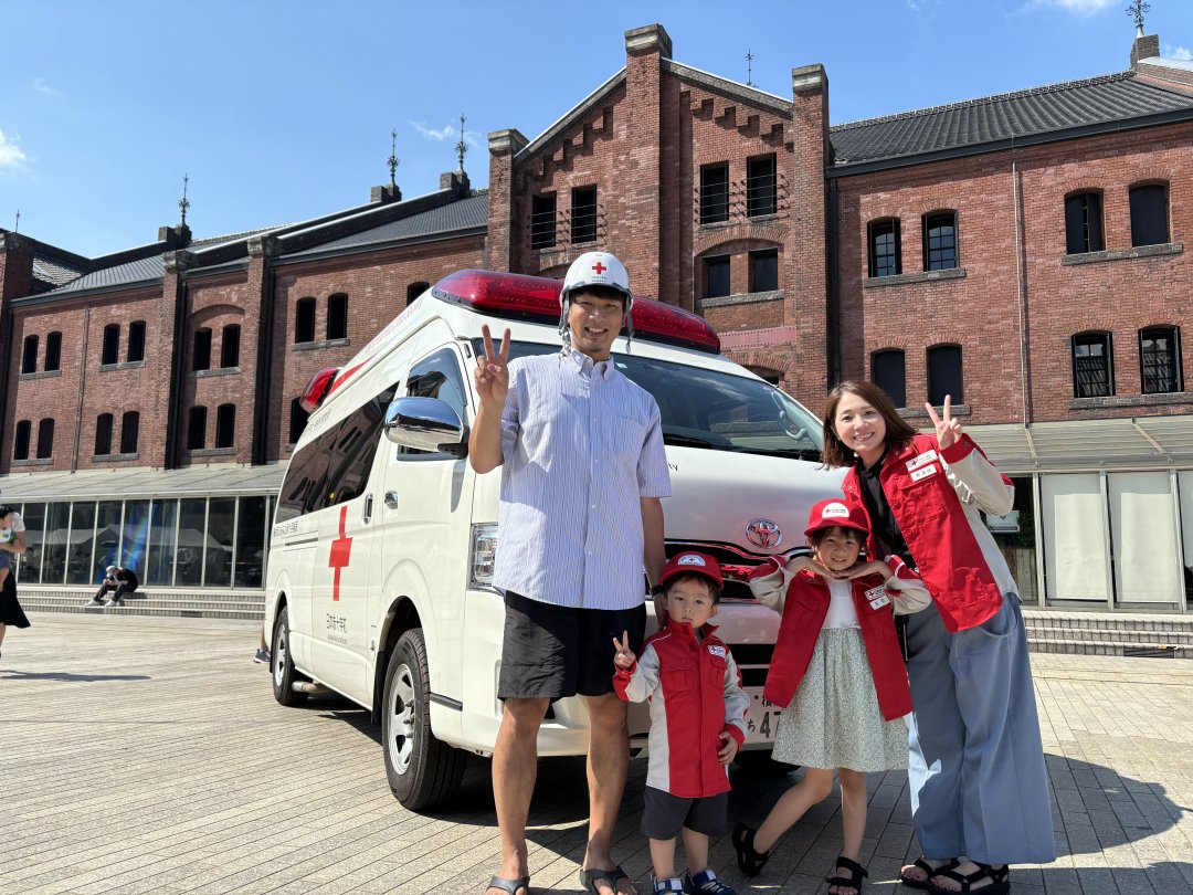 展示した救急車の前では、子ども救護服を着て写真をパシャリ。