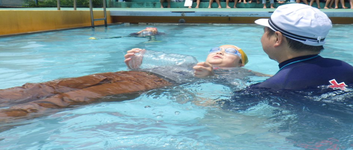 水の事故防止、泳ぎの基本と自己保全、要救助者の救助および応急手当を学びます。