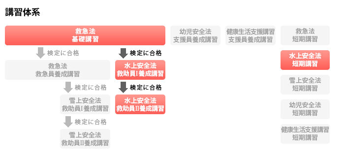 | 注意事項 | 「救急法基礎講習」修了者が水上安全法 救助員I養成講習を受講できます。 |