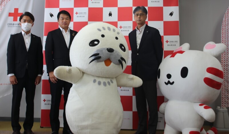 (写真左から2人目)岩下兄弟株式会社 岩下 洋三 代表取締役社長、(写真左から3人目)日本赤十字社熊本県支部 三角 浩一 事務局長