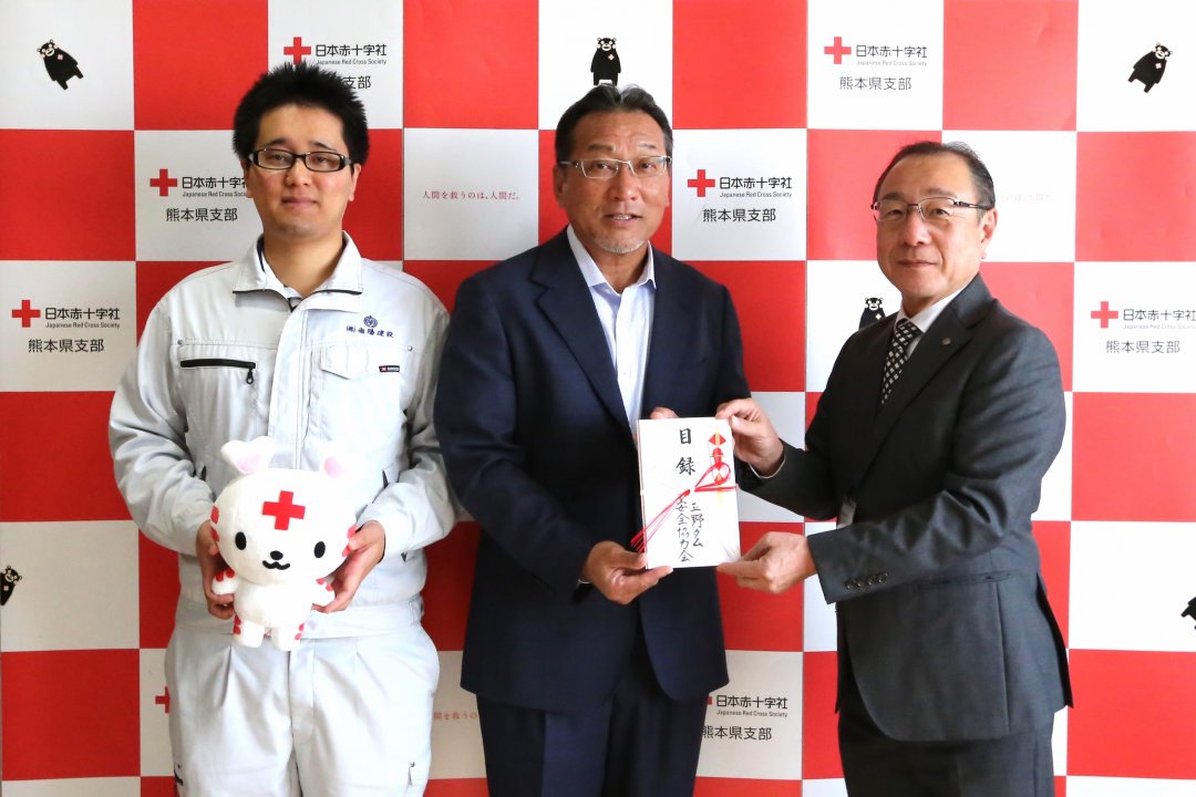 (写真左から)南陽建設総務部 古沢 奨 様、立野ダム安全協力会会長 古沢 隆 様、日赤熊本県支部事務局長 沼川 敦彦