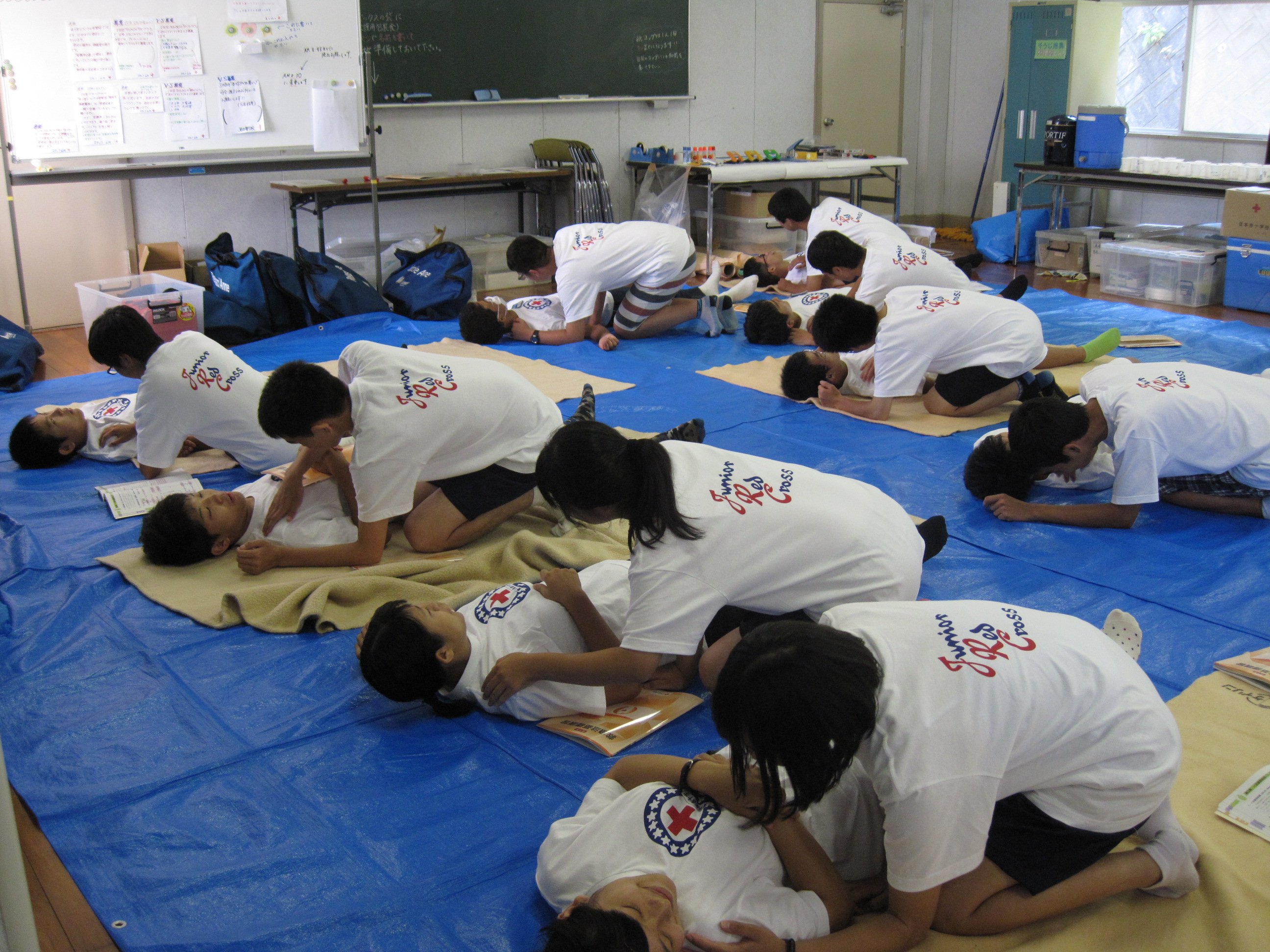 学校内で起こりやすいけがや病気の処置のしかたを学習する救急法や、お年寄りを寝たきりにさせないための健康生活支援講習、避難所生活で役立つ災害時支援セミナー、また、水の事故防止・救助法等を学びます。