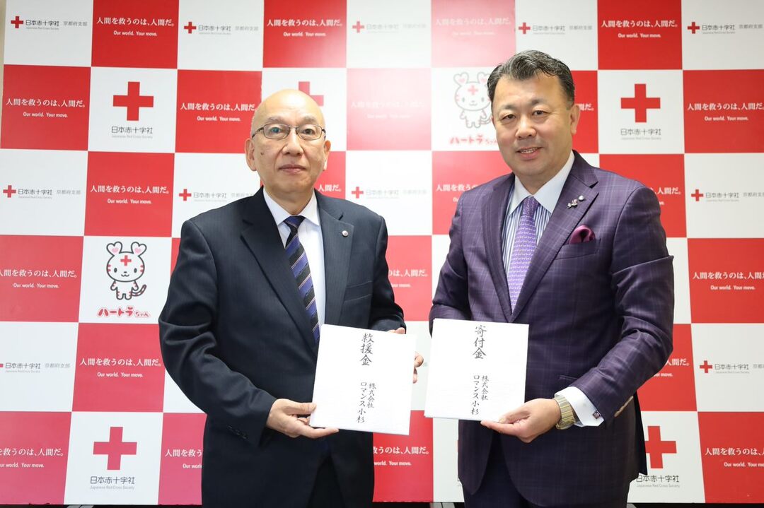 5月10日、株式会社ロマンス小杉様(京都市下京区)が、活動資金及びウクライナ人道危機救援金として多額のご寄付をお届けいただきました。同社には、毎年継続的にご支援をいただいています。