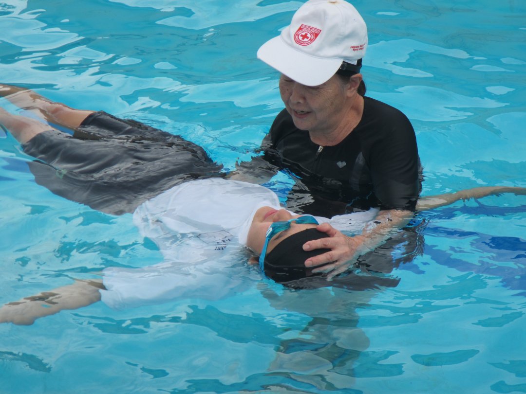 午前中の一次救命処置のトレーニングでは、「自分たちが助ける」を合言葉に、胸骨圧迫とAEDの使い方を重点的にトレーニングしました。そして、昼からはプールで着衣泳や浮き身、エレメンタリーバックストローク(通称イカ泳ぎ)などをトレーニングしました。昨年の水の事故で亡くなった方は200人を超えています。これは大きな災害によって亡くなった方の数と匹敵します。夏が近づくにつれて水の事故の悲しいニュースが増えてくるので、水上安全法指導員も大変やりがいを感じています。ぜひ、泳ぐ練習の前に溺れない練習を一緒にしましょう!