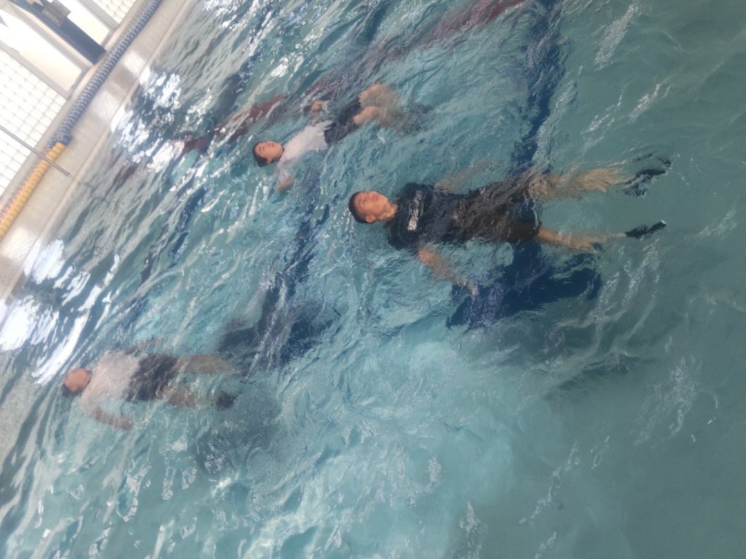 この日は、着衣の状態で浮いて救助を待つために浮き身と、通称「イカ泳ぎ」と呼ばれるエレメンタリーバックストロークを体験。