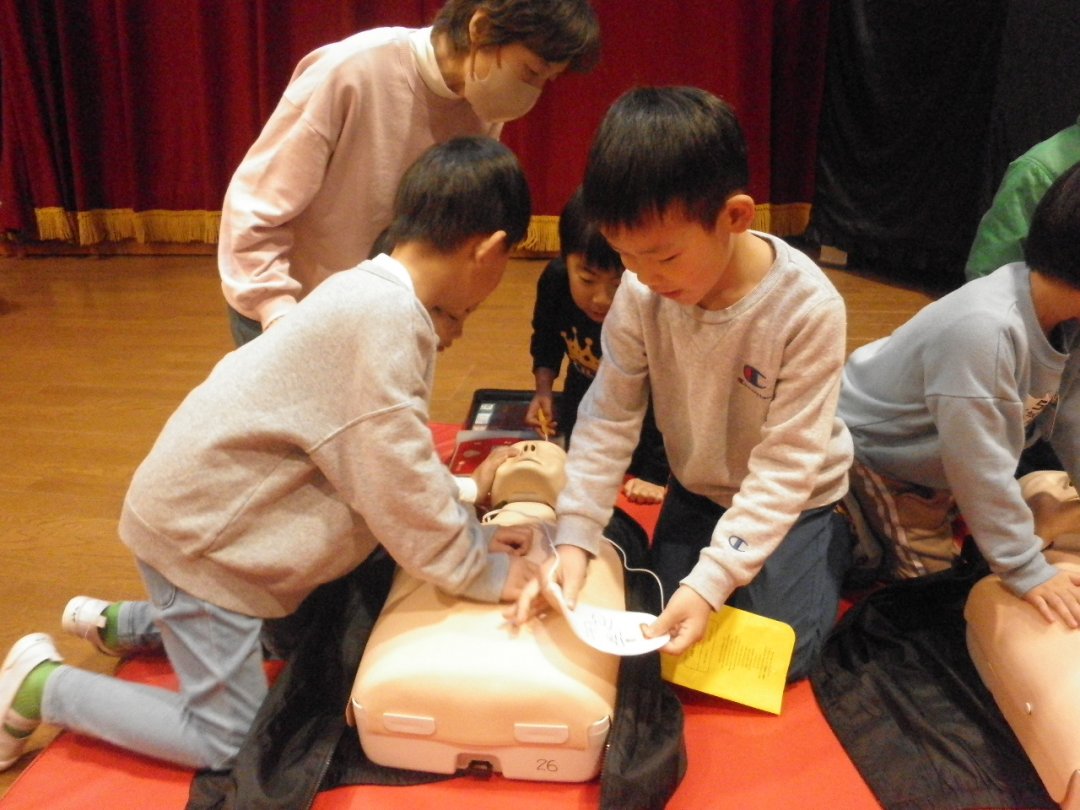 果たしてどこまで興味を持ってくれるのか心配していましたが、大人よりも大きな声で「誰か来てくださーい」と協力者を求めたり、胸骨圧迫も一人ではできなくても二人で力を合わせたり、AEDの電極パットの装着も、電気ショックのボタンを押すことも自分たちで出来ました。