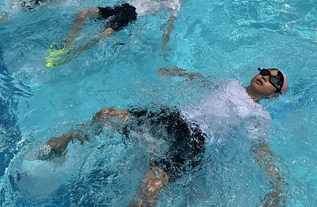 次はエレメンタリーバックストローク(通称:イカ泳ぎ)を練習します。手足を動かさずに浮いて待つを実際にやってみると、ある程度練習をしていないと難しいことがわかります。また、川や海では水面が動くので口や鼻から水が入ってくるなど呼吸が困難になります。そんな時は浮き身の状態でゆっくり大きく手足を広げて、閉じる。ゆっくり手足を広げて、閉じるを繰り返すエレメンタリーバックストロークという泳ぎで救助を待ちます。もしくは一番近づける浅瀬を目指します。単に浮くよりも推進力を得ることで浮きやすくなります。
