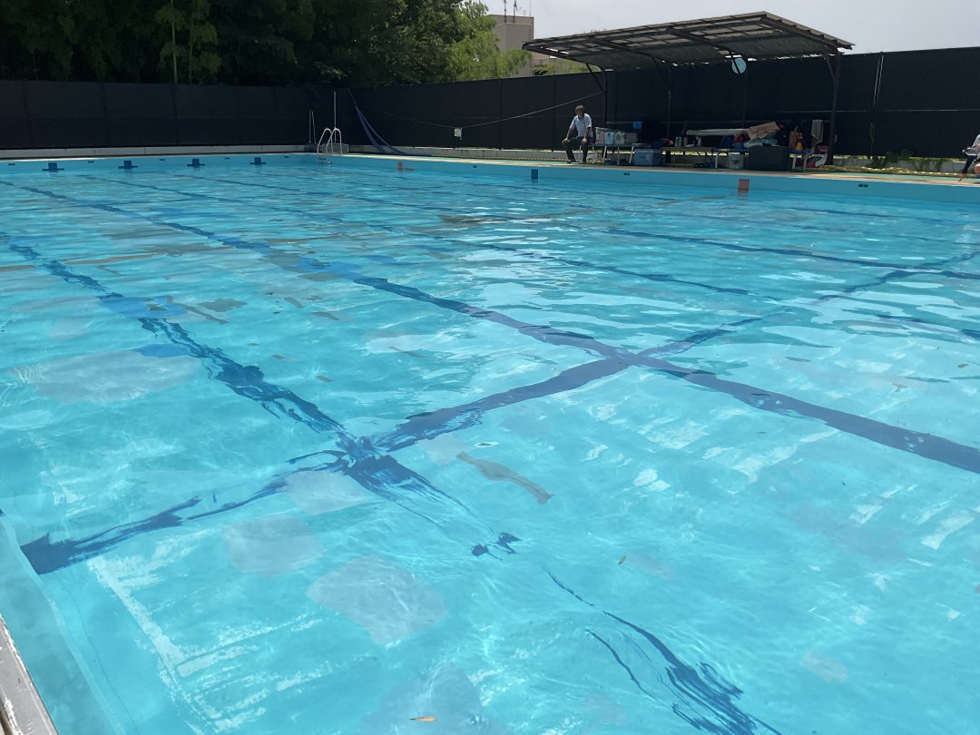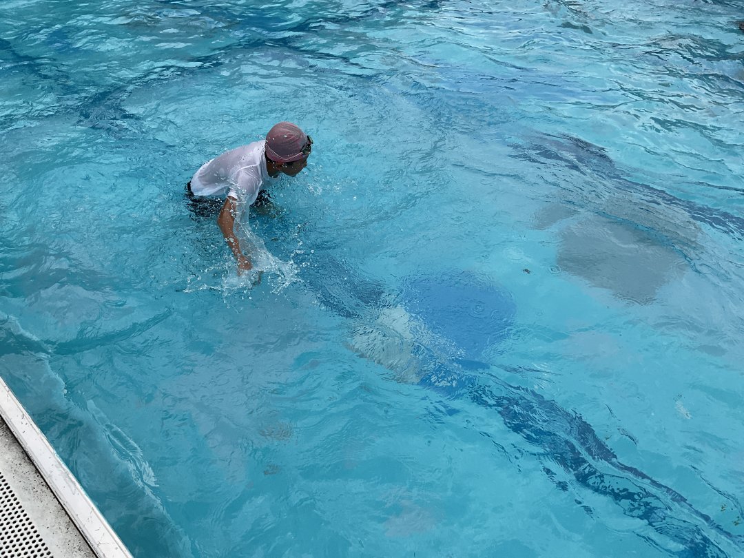 まずは溺れるということを学びます。水に溺れている人というと、水面で両手でバシャバシャとしながら大声で「助けて−!」と叫ぶ人をイメージするかもしれませんが、実際には声を出せずに短時間のうちに水没する人がほとんどです。皆さんはこのプールの画像のどこに人が沈んでいるか分かりますか?沈んでしまった人を発見することは困難です。重要なのは溺れる人を出さないことです。遊びなどでも2人1組のバディシステムを活用して、常にお互いの安全を確認し合いましょう。