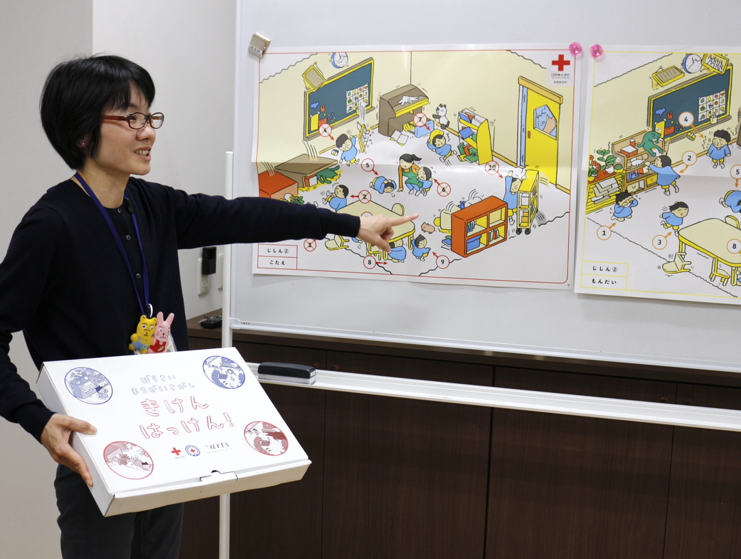 日赤の防災講座は、須坂市内の保育園や学校、地域に出向いて、広く市民を対象に開催していて、好評をいただいています。イラストを見て、身の回りのどこに危険があるかを学んでもらう防災教材「ぼうさいまちがいさがし きけんはっけん!」を使って、子どもから大人まで楽しく学んでもらったり、日赤から指導者を派遣してもらい、避難所でさまざまなことが起こった時、それぞれがどんな役割をすべきかを学ぶ避難所体験ゲームをしたりしています。