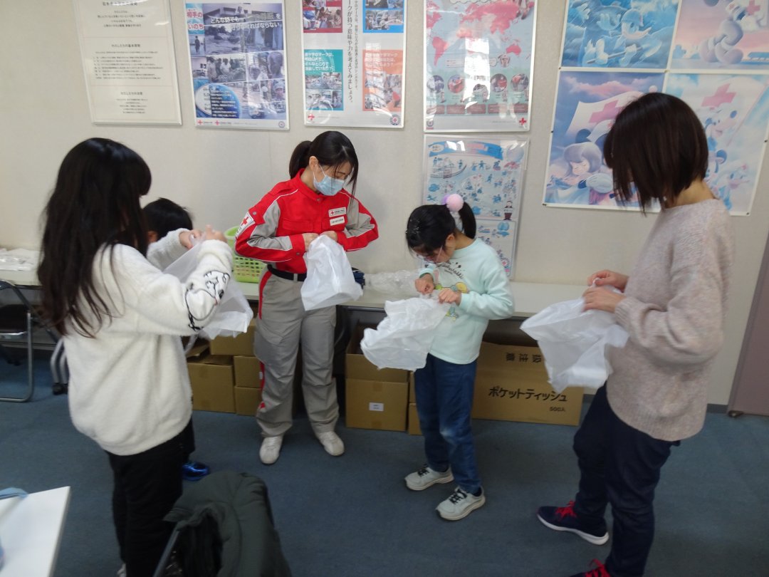 冬休みに県内各地から児童、生徒が参加し、ラップやビニール袋など身近なものを使った手当、毛布ガウンやホットタオルなど非常時に対応できる知識を学びました。