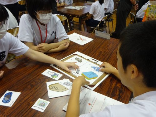 各グループに分かれて防災について話し合ったり、限られた時間で何を持って避難するかをカードを使って体験しました。チームによって持ち出すものが違って、様々な考えがあることを学びました。 |