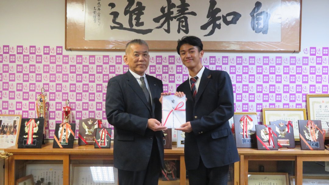 読谷小の生徒から「NHK海外たすけあい」募金第1号贈呈を受け取りました